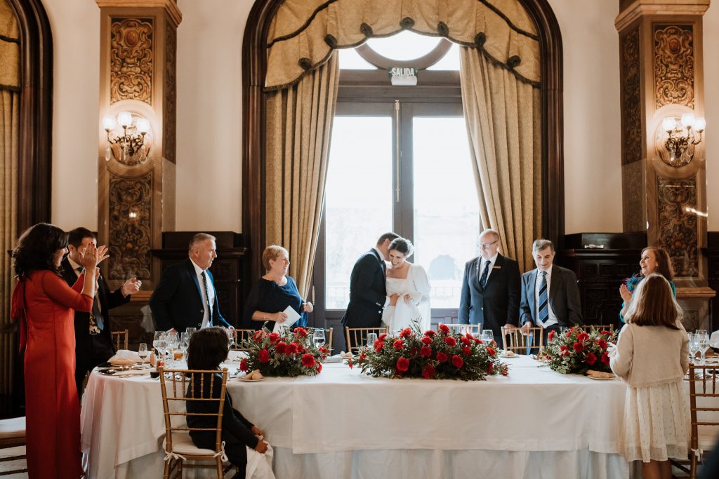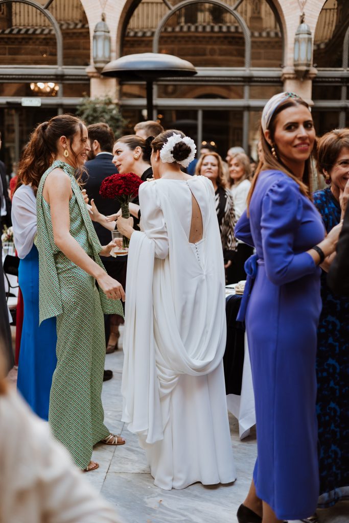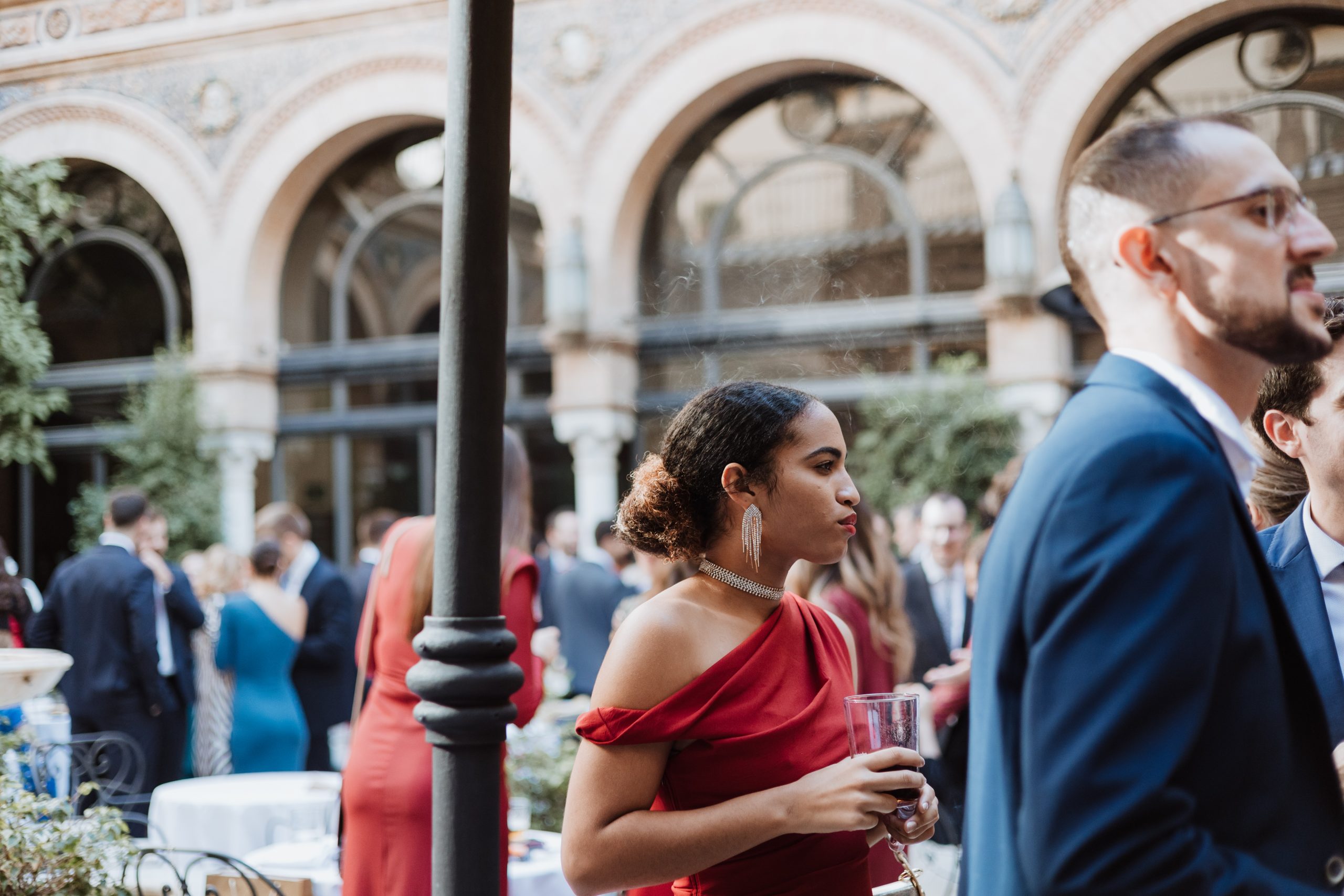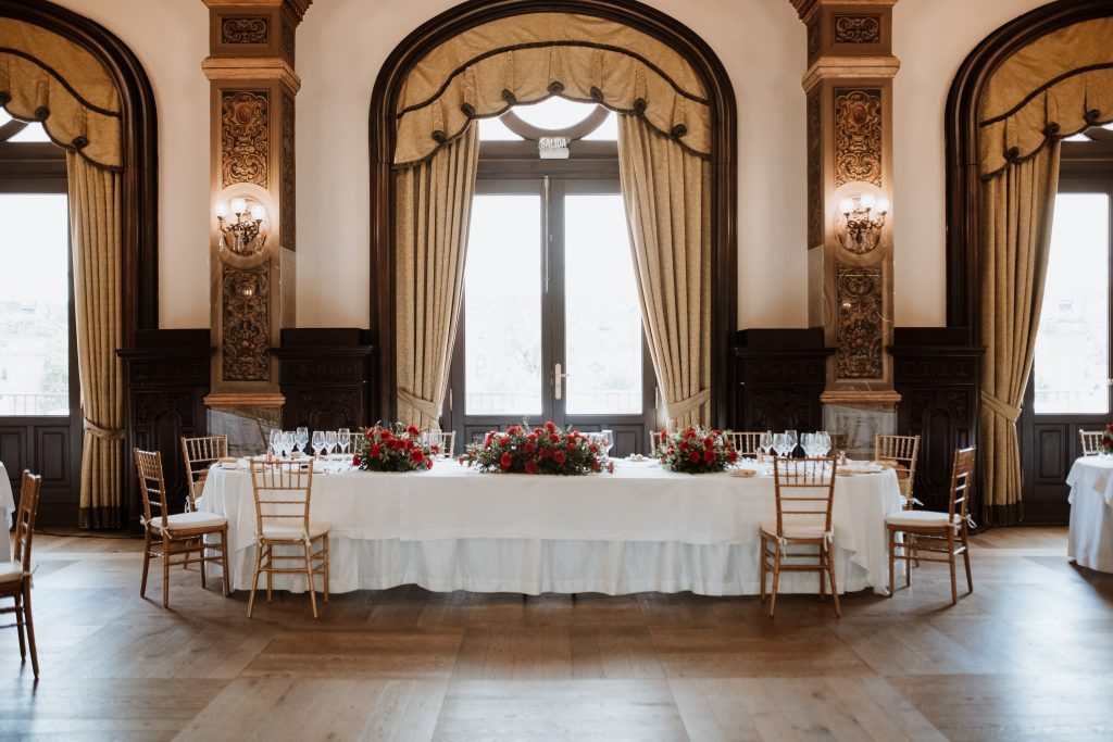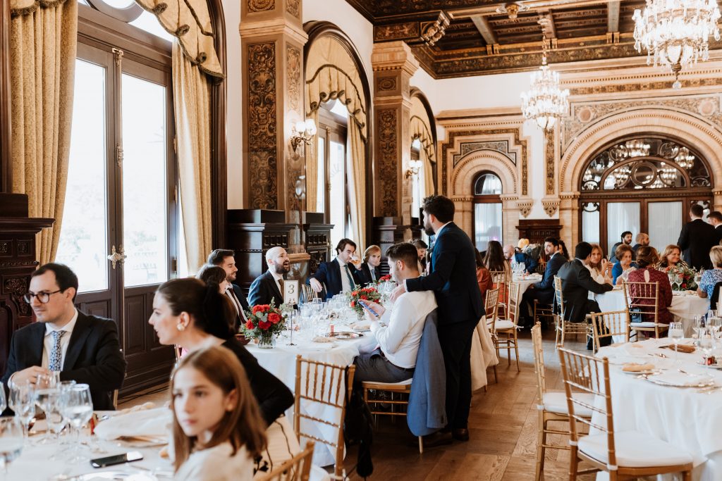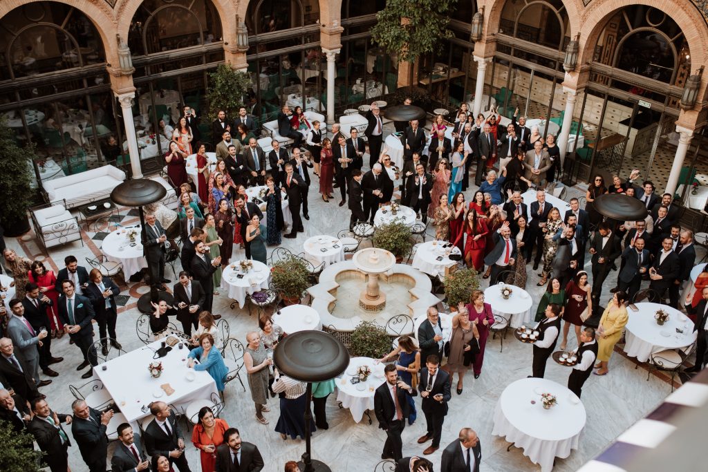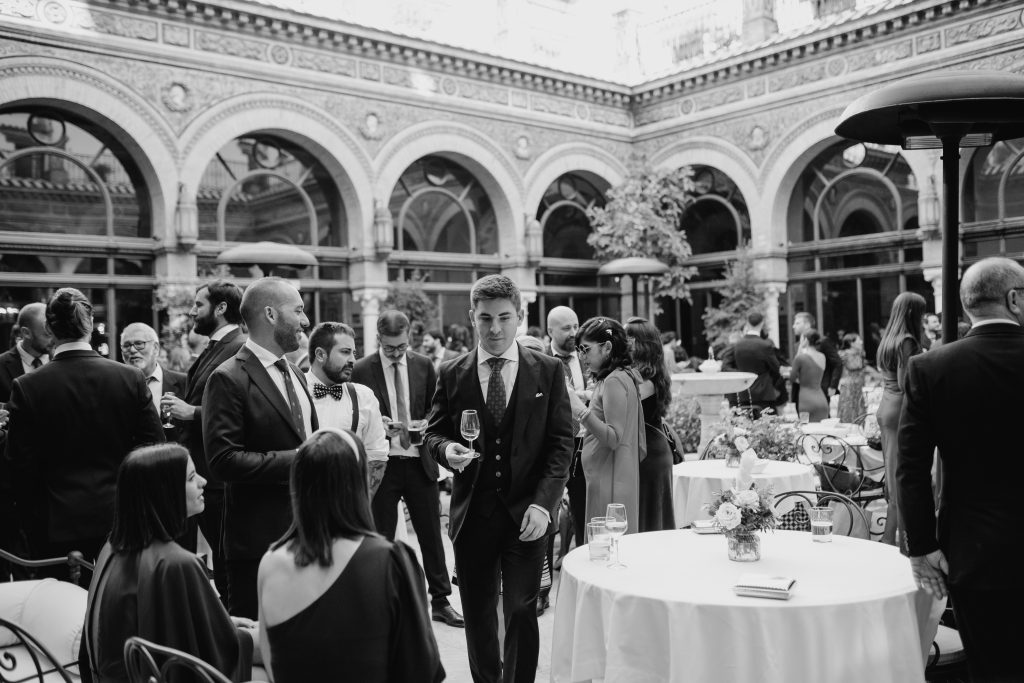Tras la ceremonia, los invitados disfrutaron de un cóctel en los elegantes patios centrales del hotel, con vistas que envolvían el majestuoso interior del patio de luz del Hotel. La comida se sirvió en un salón con grandes ventanales que permitían disfrutar de la luz natural, decorado con lámparas de araña y detalles dorados y sofisticados que aportaron un toque de distinción.