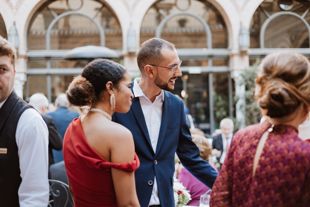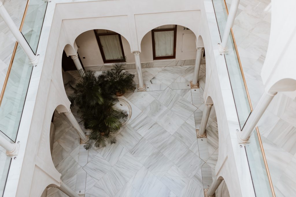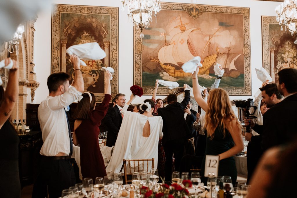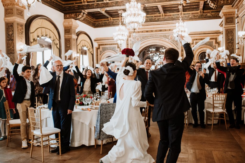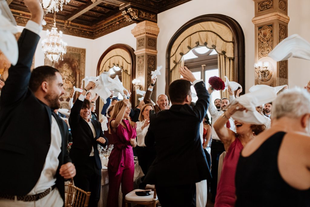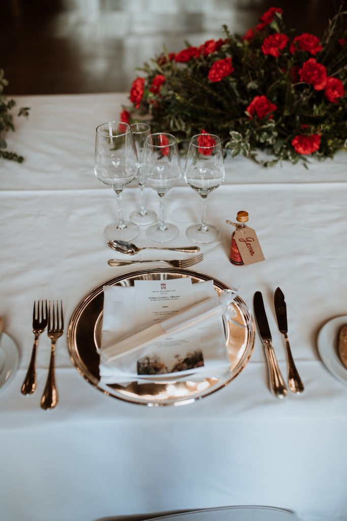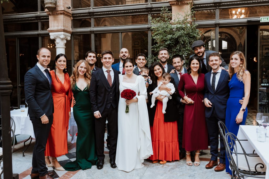 Tras la ceremonia, los invitados disfrutaron de un cóctel en los elegantes patios centrales del hotel, con vistas que envolvían el majestuoso interior del patio de luz del Hotel. La comida se sirvió en un salón con grandes ventanales que permitían disfrutar de la luz natural, decorado con lámparas de araña y detalles dorados y sofisticados que aportaron un toque de distinción.