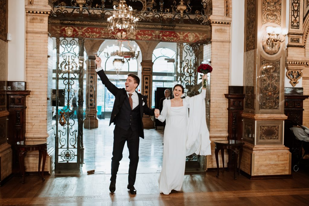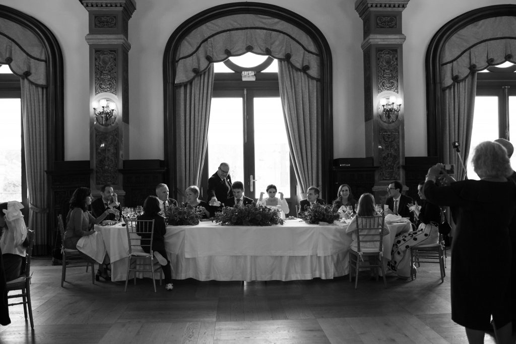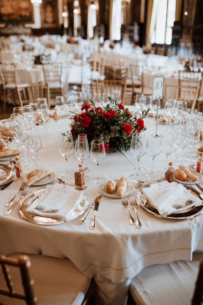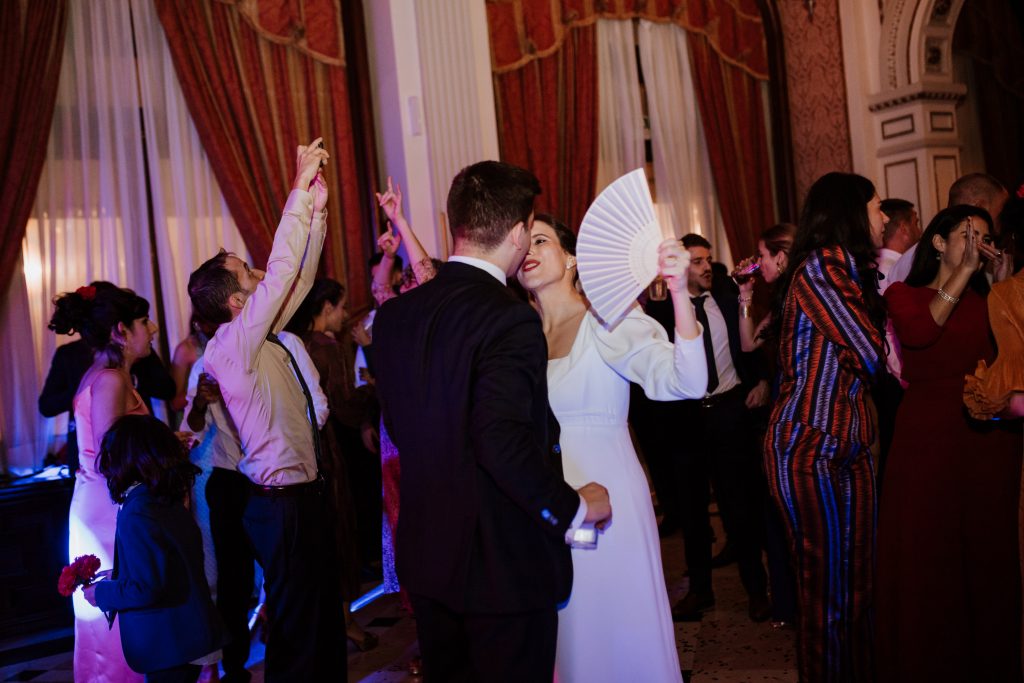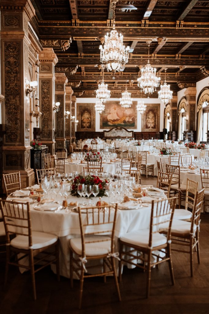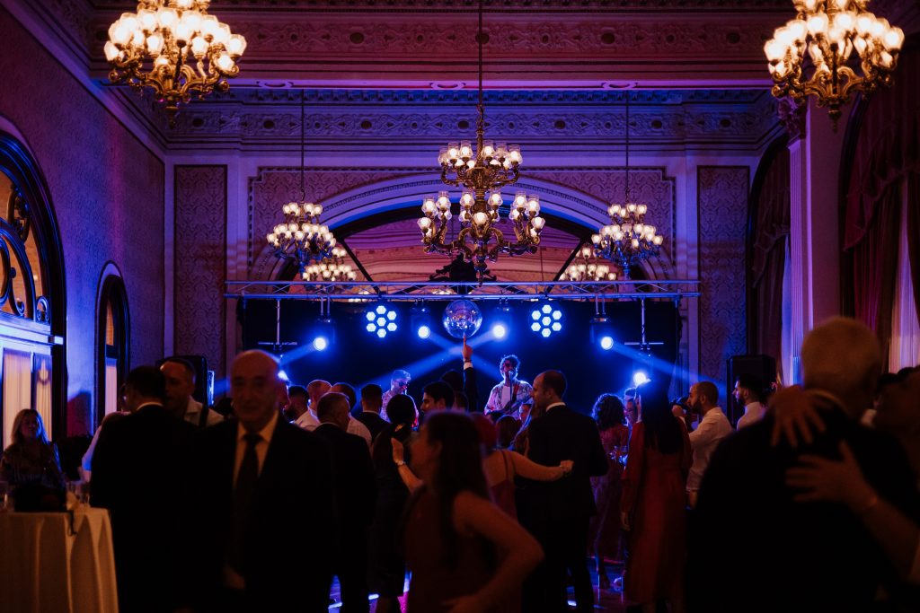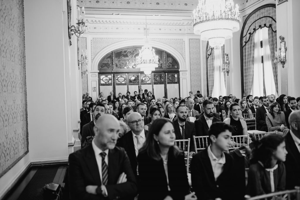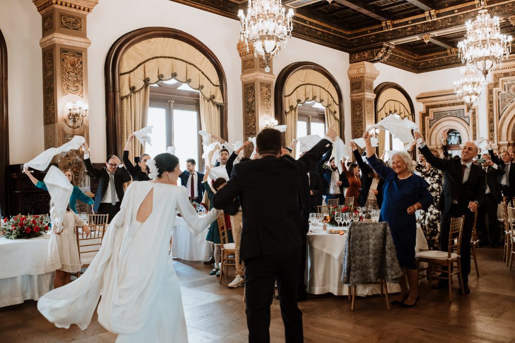 Tras la ceremonia, los invitados disfrutaron de un cóctel en los elegantes patios centrales del hotel, con vistas que envolvían el majestuoso interior del patio de luz del Hotel. La comida se sirvió en un salón con grandes ventanales que permitían disfrutar de la luz natural, decorado con lámparas de araña y detalles dorados y sofisticados que aportaron un toque de distinción.
