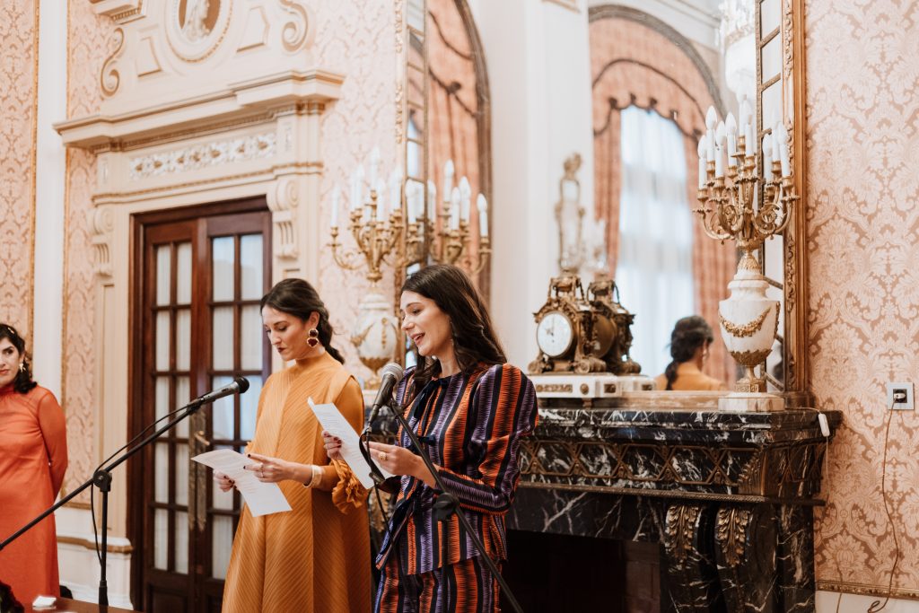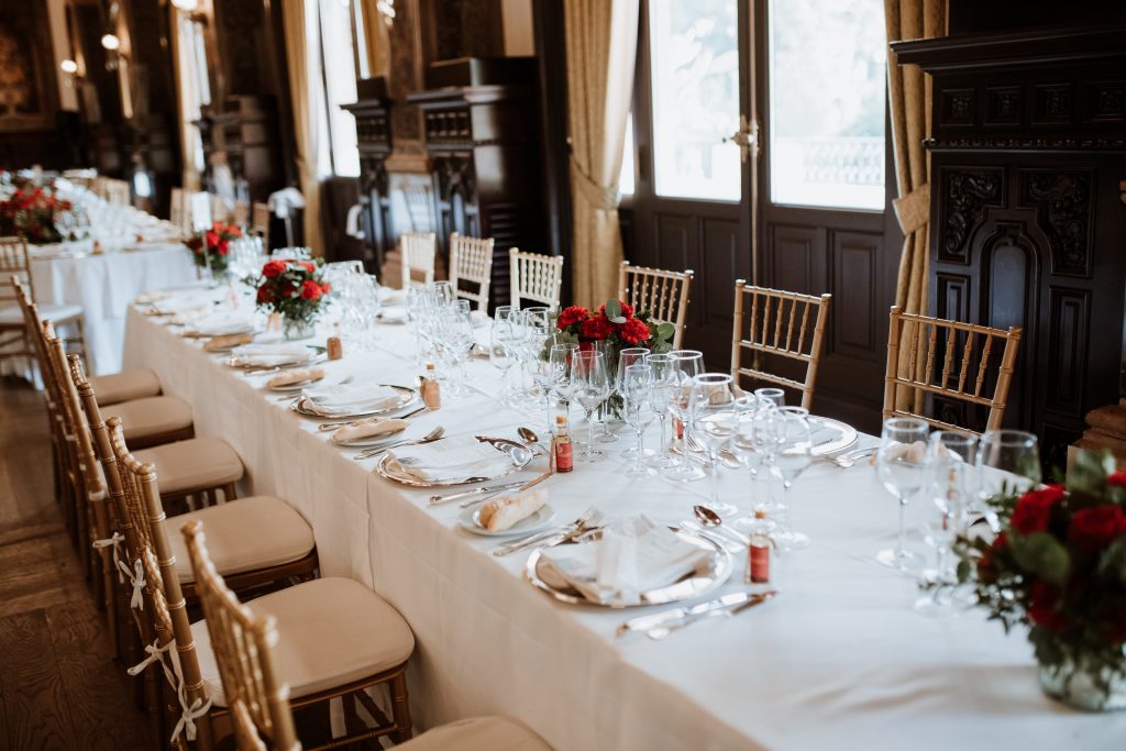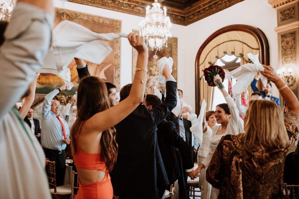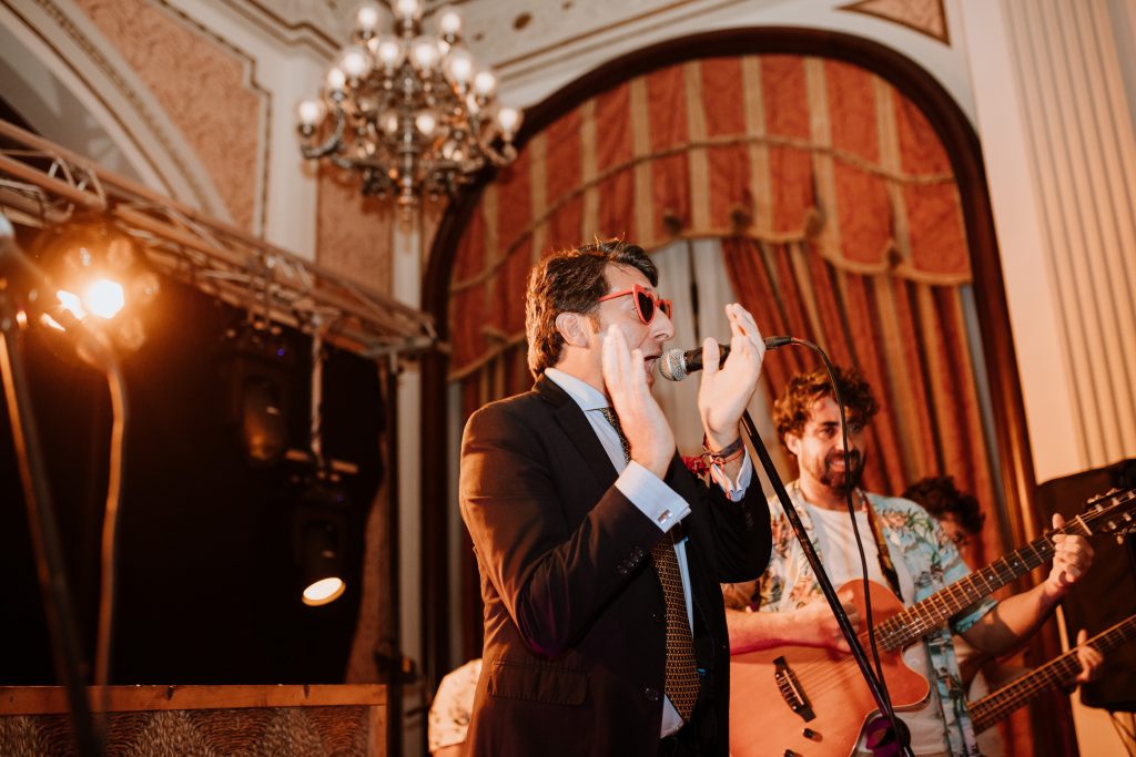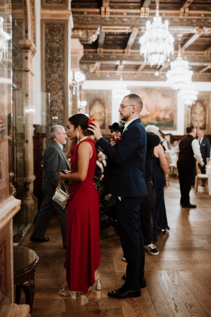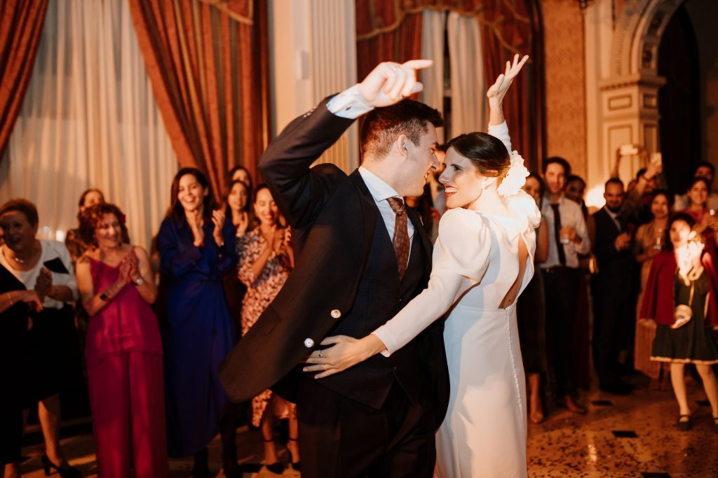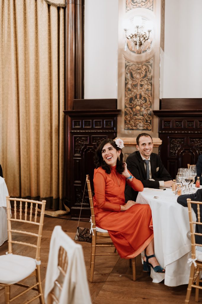 Tras la ceremonia, los invitados disfrutaron de un cóctel en los elegantes patios centrales del hotel, con vistas que envolvían el majestuoso interior del patio de luz del Hotel. La comida se sirvió en un salón con grandes ventanales que permitían disfrutar de la luz natural, decorado con lámparas de araña y detalles dorados y sofisticados que aportaron un toque de distinción.