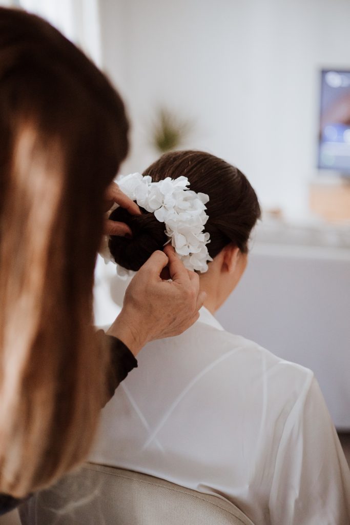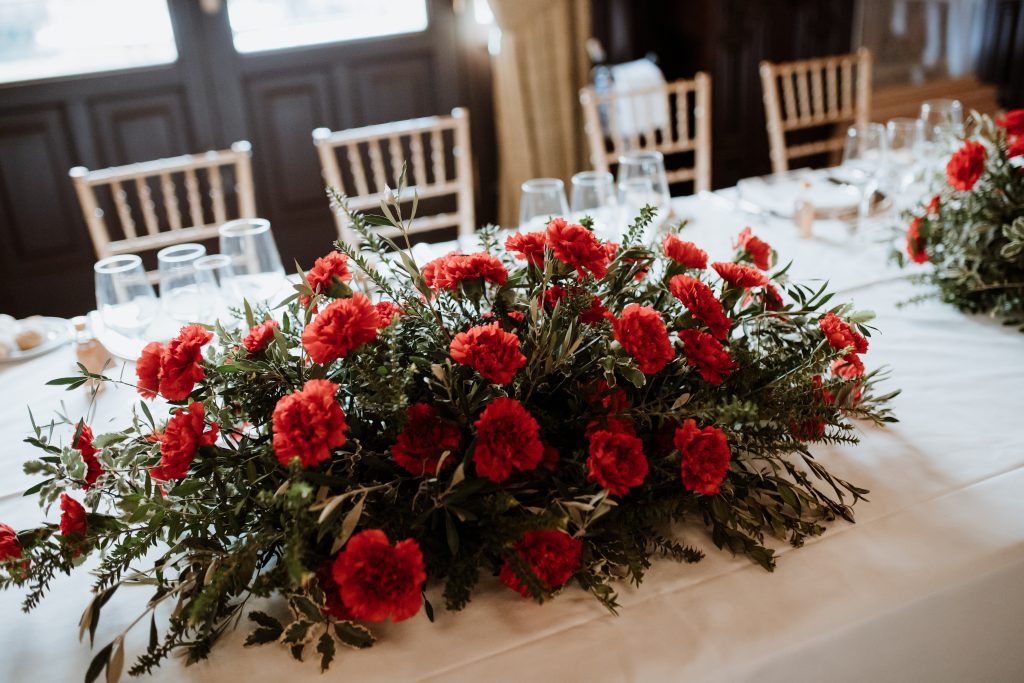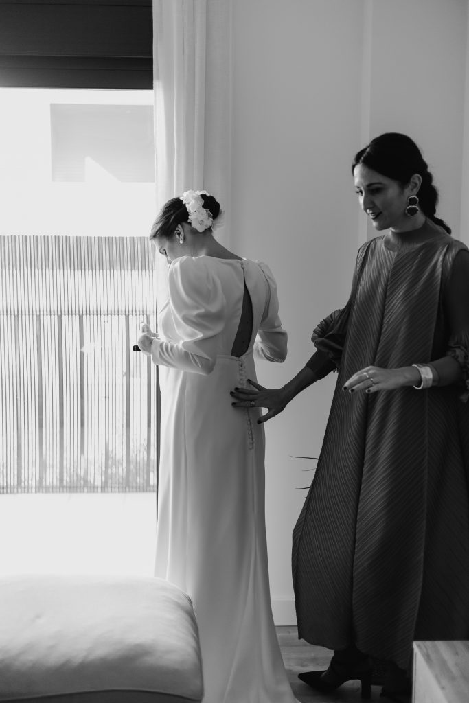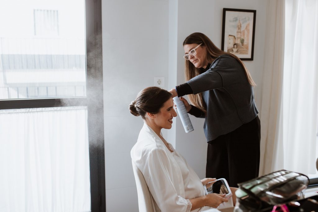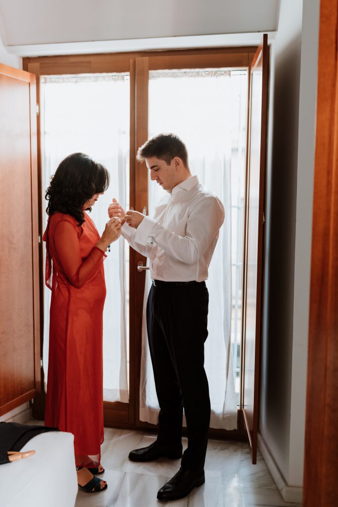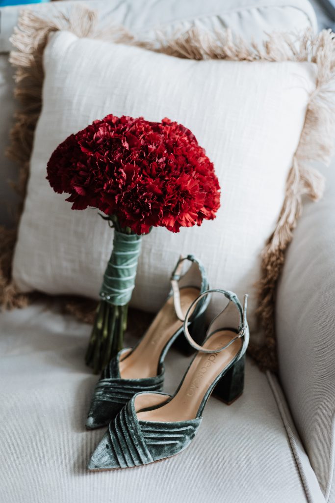 Los preparativos de la novia y el novio se realizaron de manera privada en espacios propios. La novia lució un maquillaje natural que realzó su radiante sonrisa, con un peinado sencillo y elegante. Su ramo, de claveles naturales en tonos rojos, complementó perfectamente su look de novia moderna y clásica a la vez.