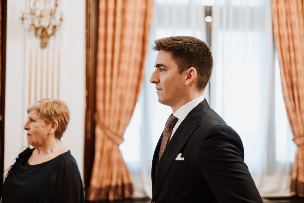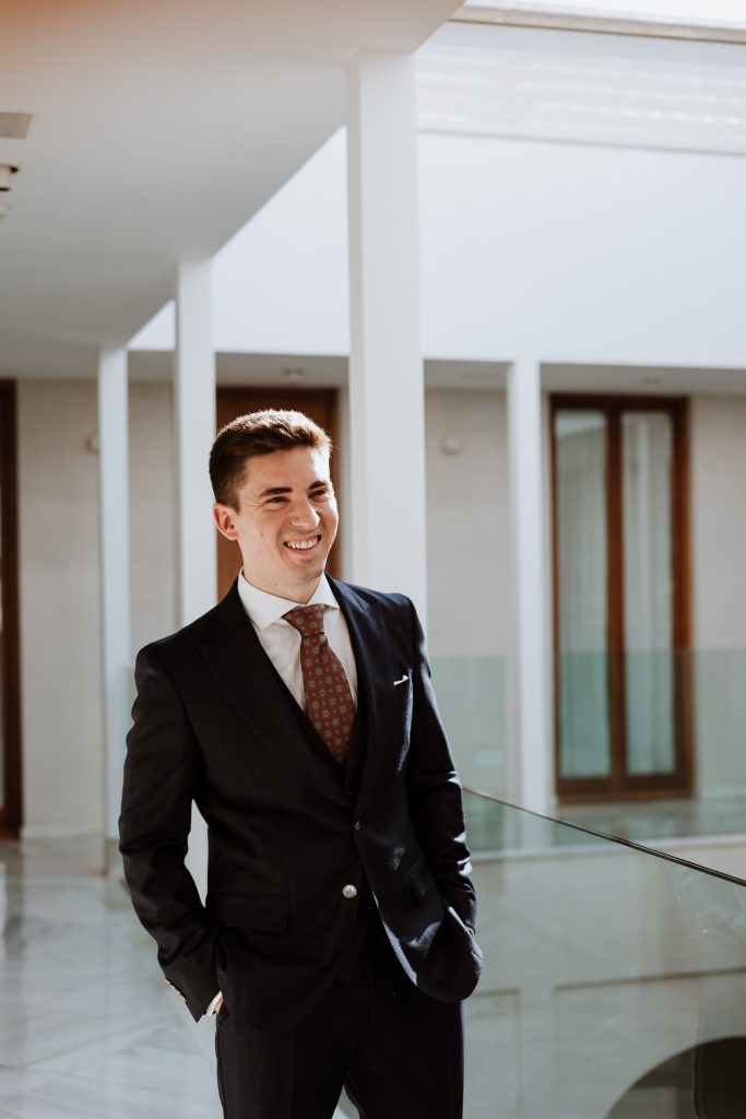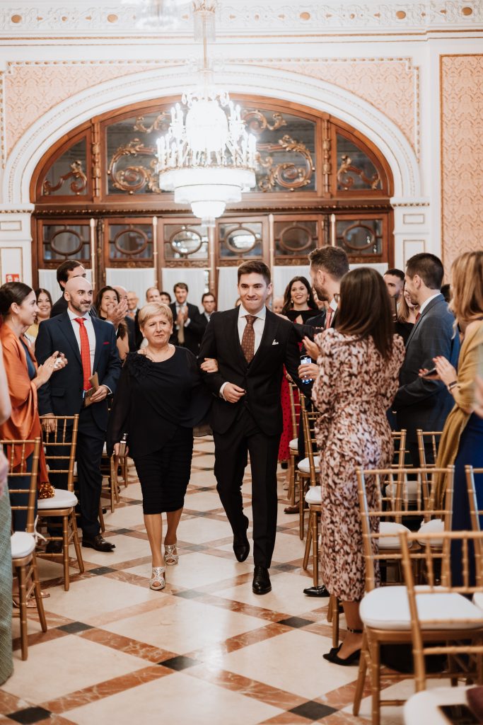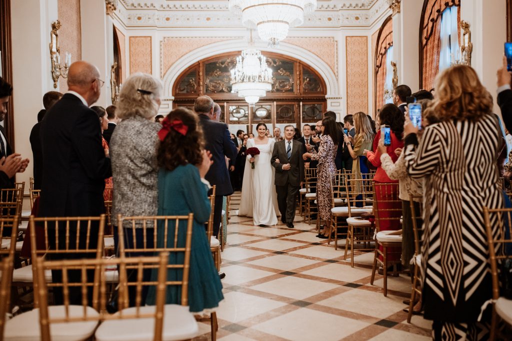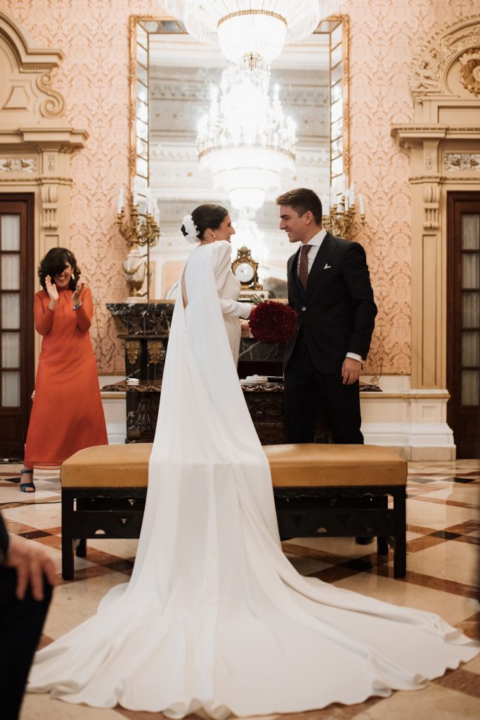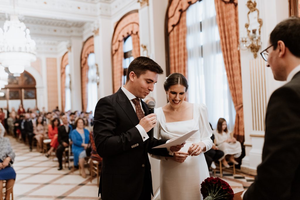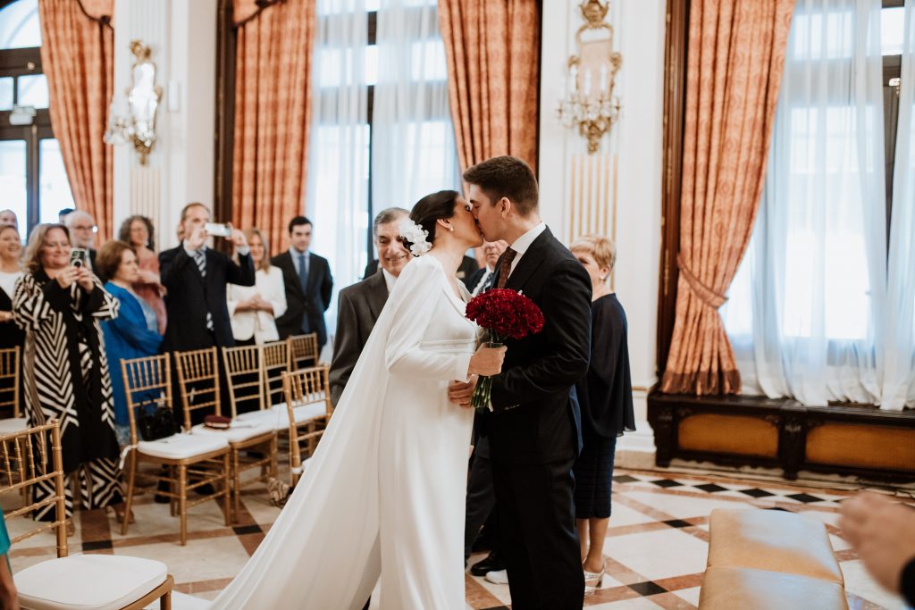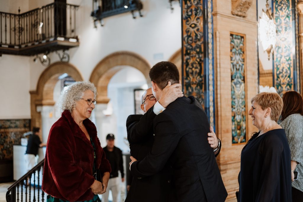 La ceremonia civil tuvo lugar en uno de los hermosos salones del hotel, decorado con detalles florales en tonos pastel y velas que crearon un ambiente cálido y romántico. La arquitectura del Alfonso XIII, con sus techos altos, columnas y detalles artísticos, aportó un toque de majestuosidad y tradición, haciendo que cada momento fuera muy emotivo, rodeados de familiares y amigos cercanos.