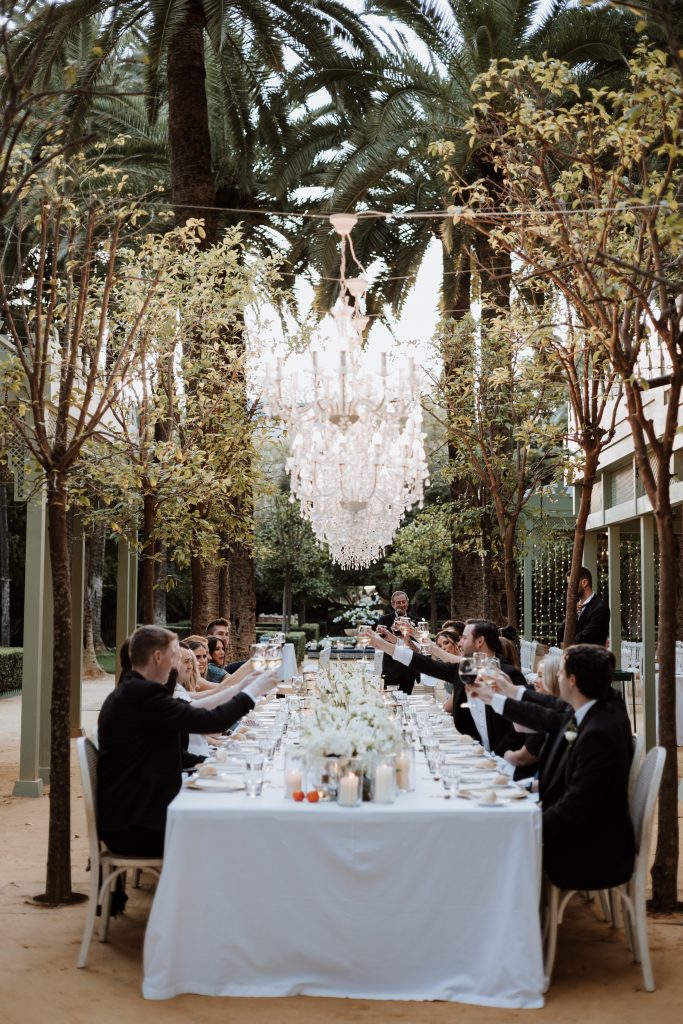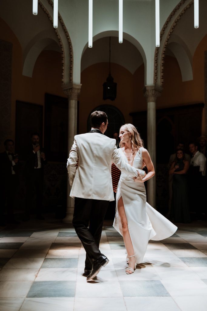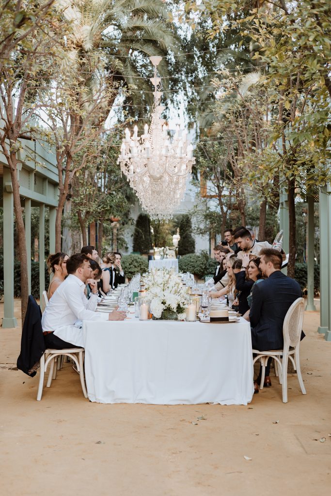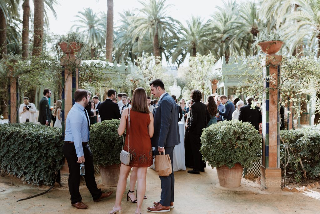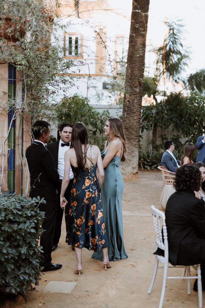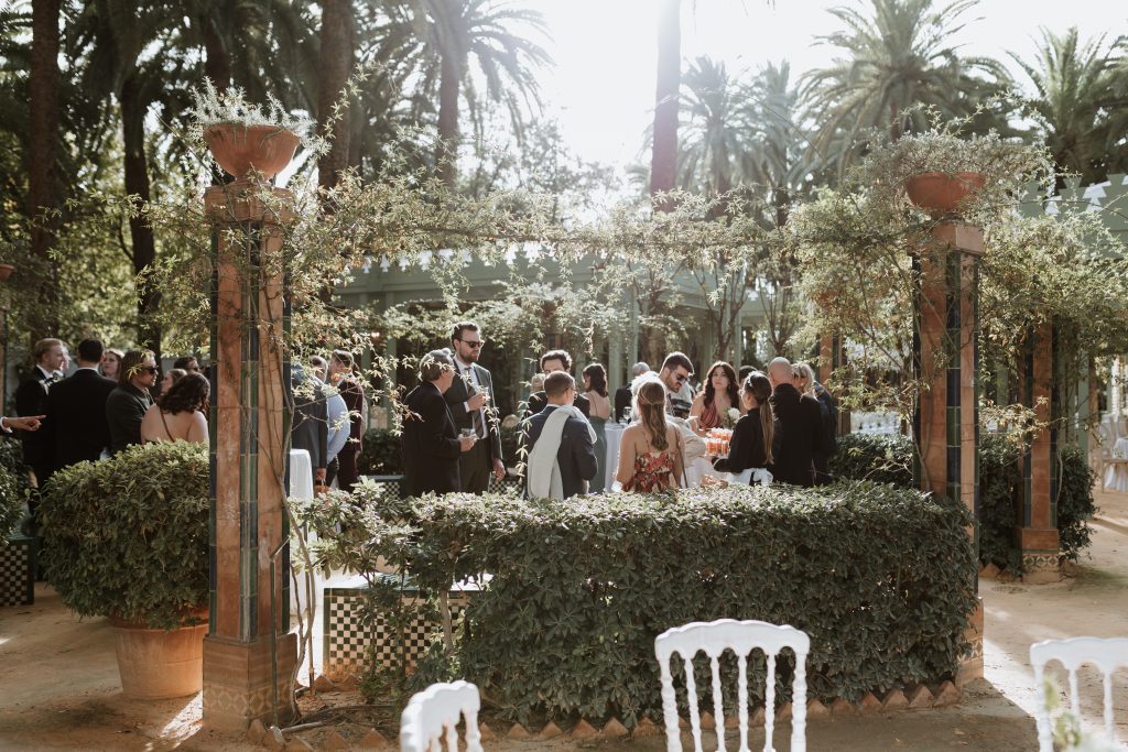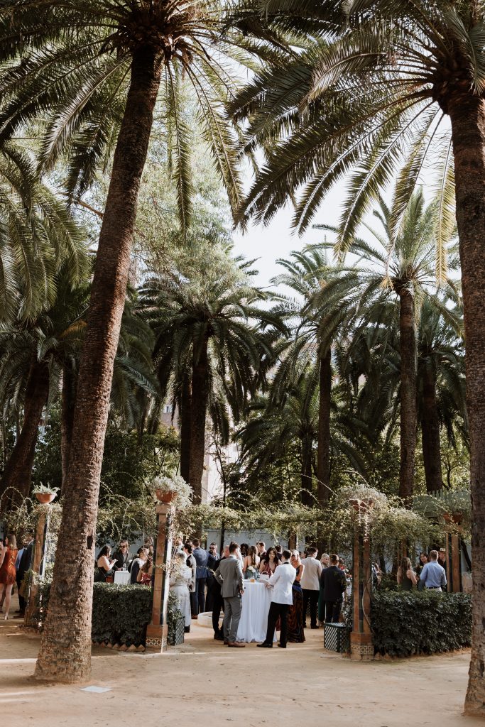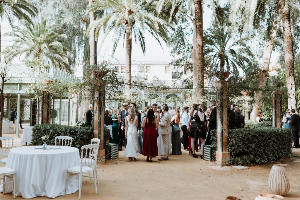 Tras la ceremonia, la fiesta continuó en un elegante salón con vistas a un jardín que recuerda a los famosos jardines del parque María Luisa de la ciudad. La decoración combinaba elementos tradicionales sevillanos con detalles modernos, creando un ambiente cálido y sofisticado. La música en vivo, con fusiones de estilos internacionales, animó a todos a bailar y disfrutar.
