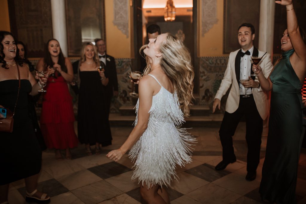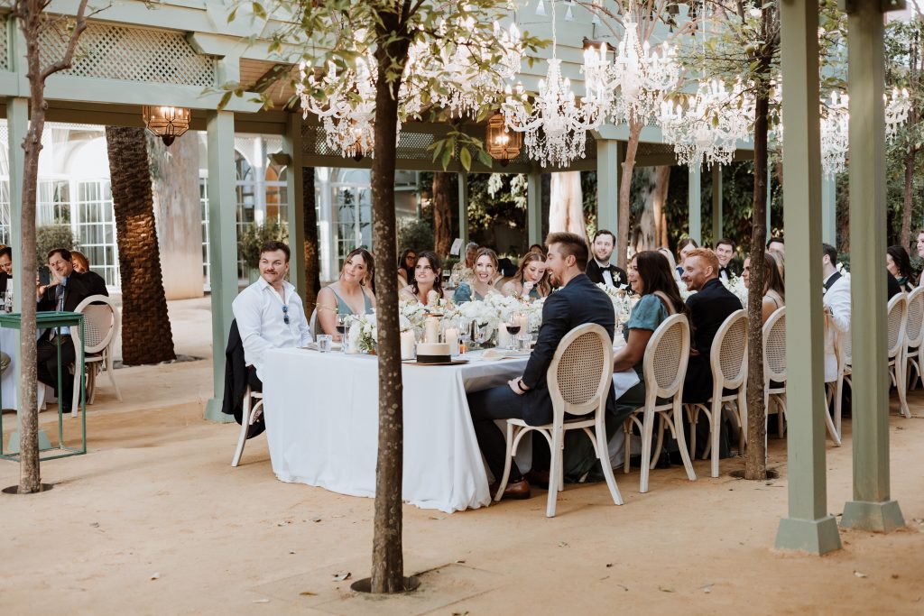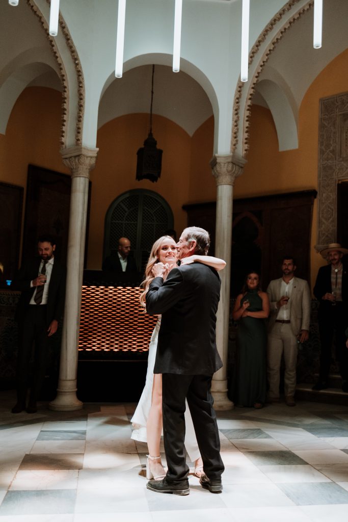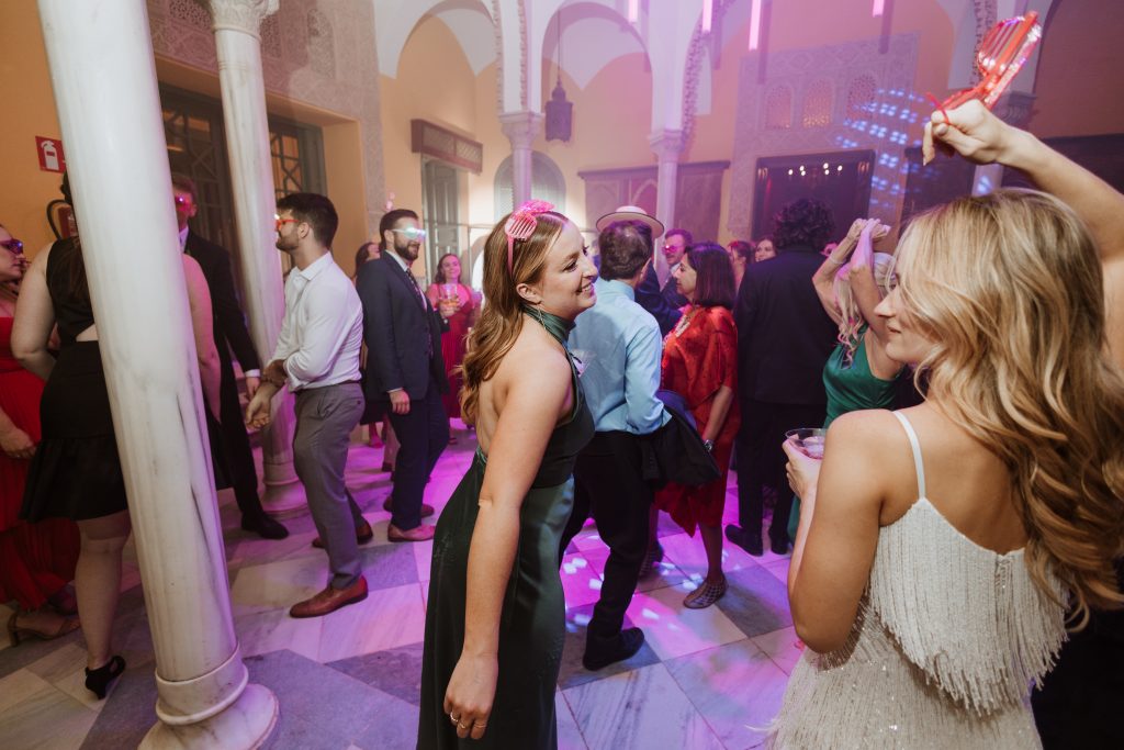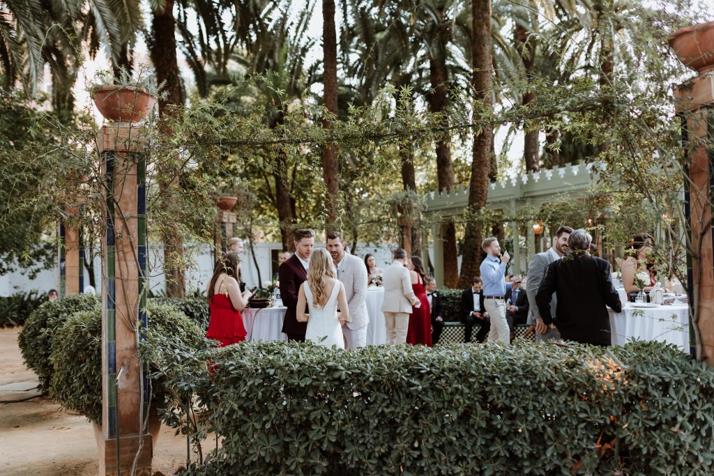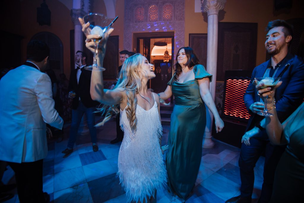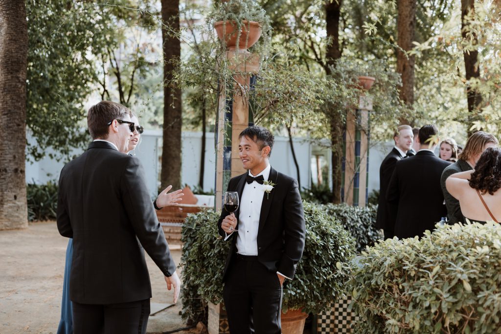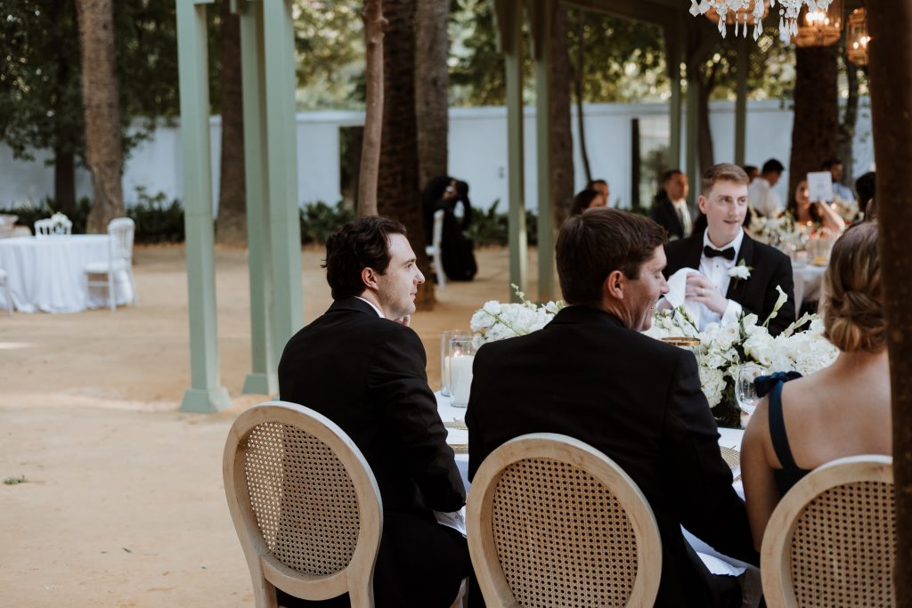 Tras la ceremonia, la fiesta continuó en un elegante salón con vistas a un jardín que recuerda a los famosos jardines del parque María Luisa de la ciudad. La decoración combinaba elementos tradicionales sevillanos con detalles modernos, creando un ambiente cálido y sofisticado. La música en vivo, con fusiones de estilos internacionales, animó a todos a bailar y disfrutar.