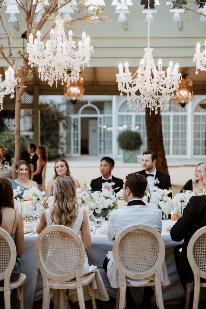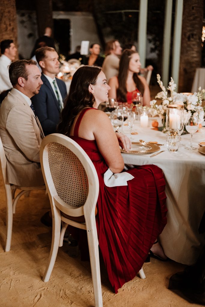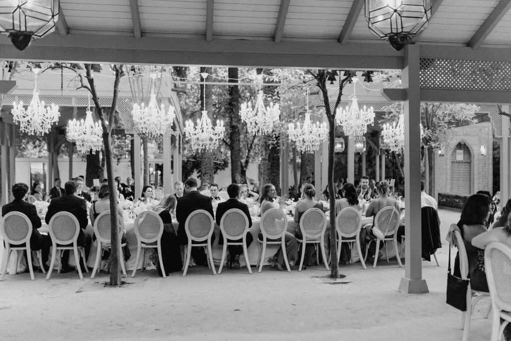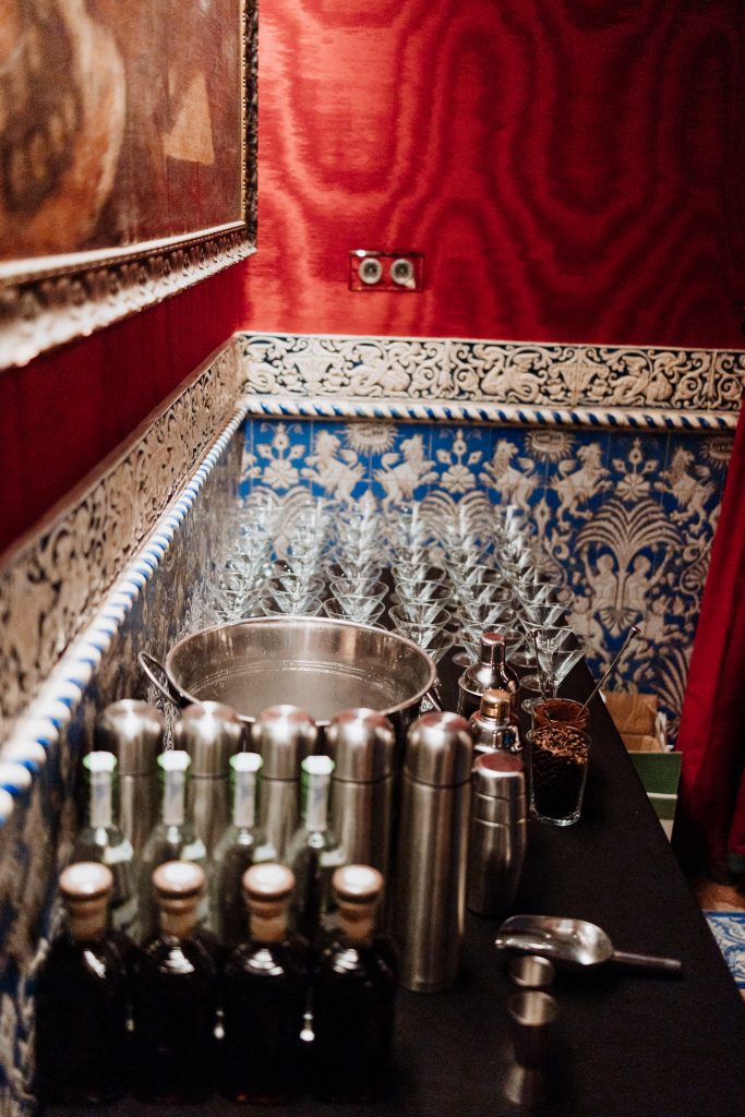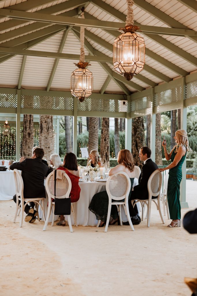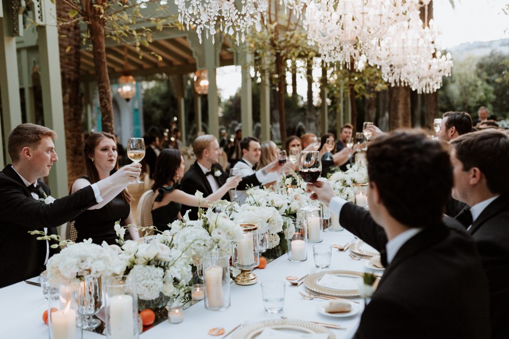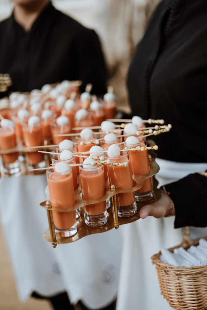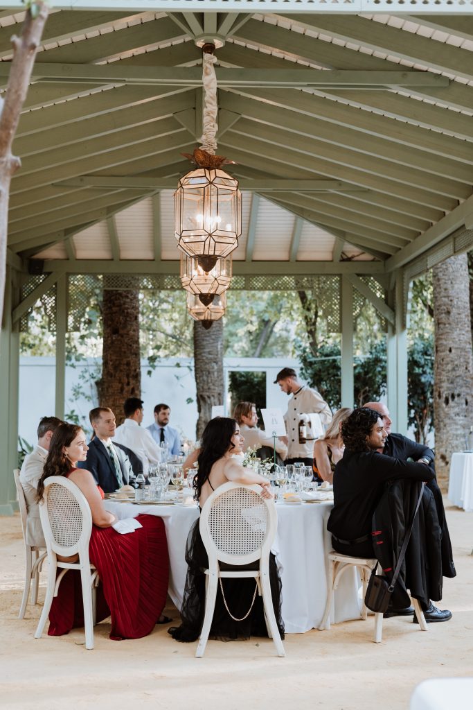 La comida fue un festín de sabores internacionales y sevillanos, servido en un patio exterior de alvero decorado con elementos muy de Sevilla como son las naranjas y muchas flores vibrantes. Los invitados disfrutaron de platos típicos de diferentes culturas, acompañados de vinos locales y música en vivo que invitaba a bailar y celebrar.