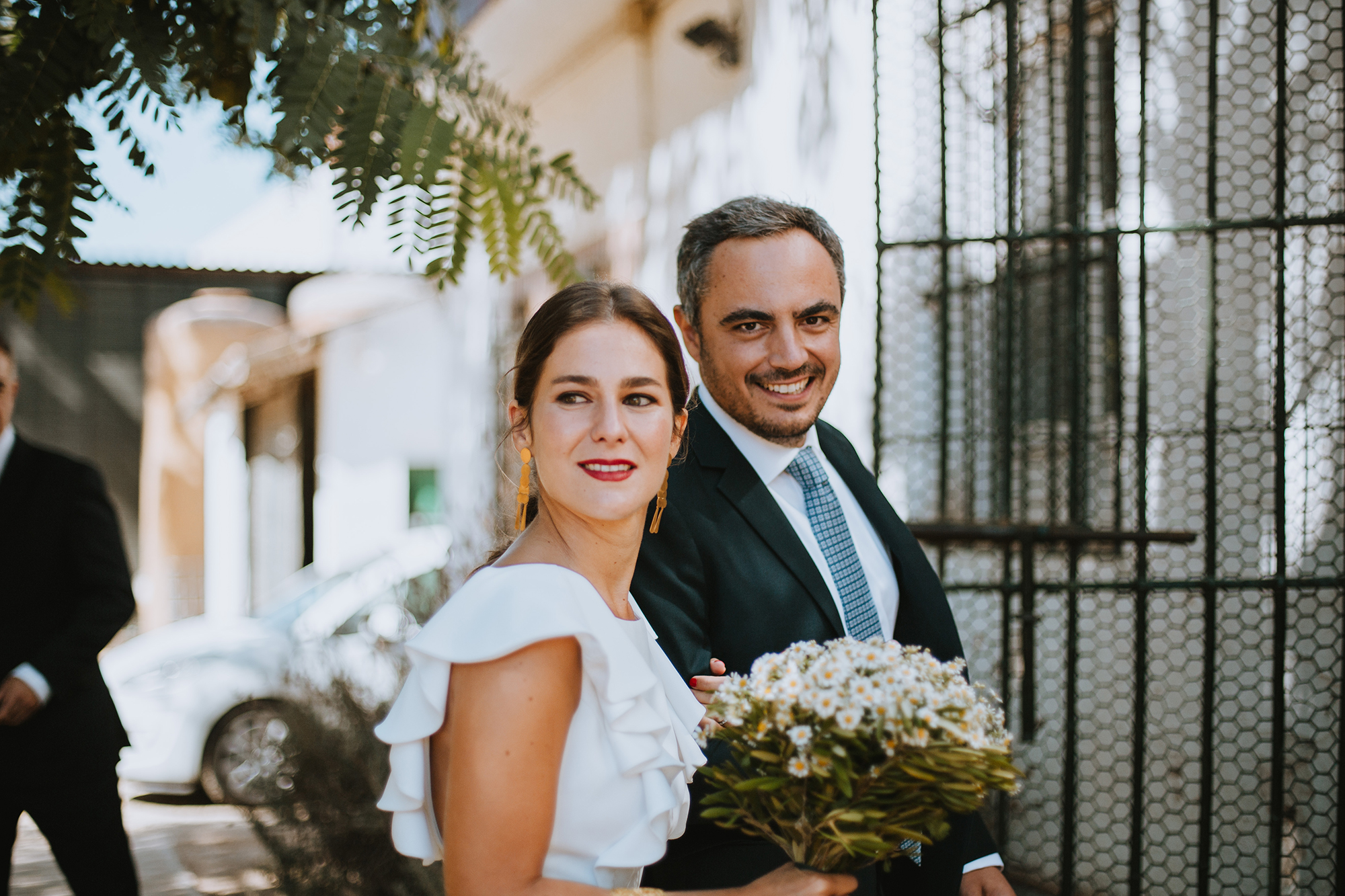 La novia vestía un precioso diseño de Belén Miranda, un diseño juvenil y diferente, acompañado por un ramo de flores de margaritas naturales y frescas, de su peinado se encargó Rocío del Real y de su maquillaje Cristina Gordillo, sus zapatos de ante en tonos verde mint de Jorge Larrañaga.