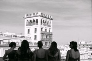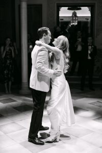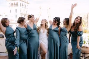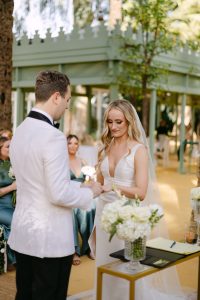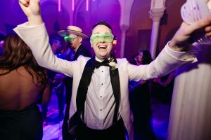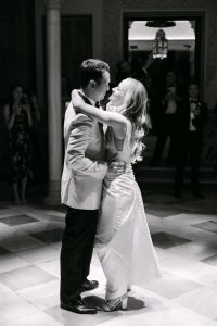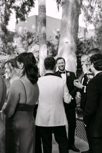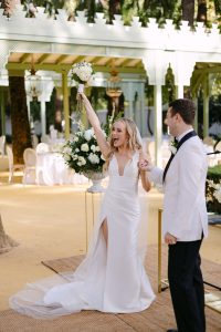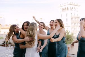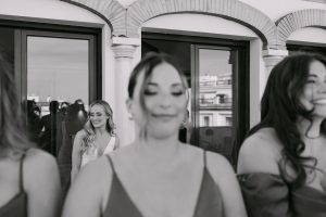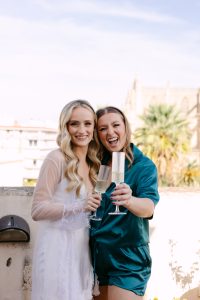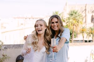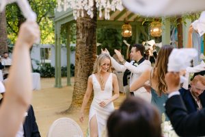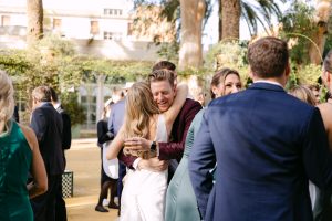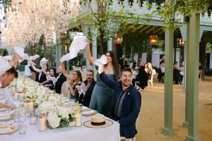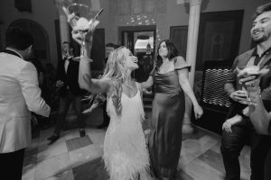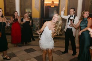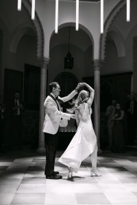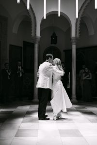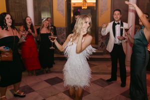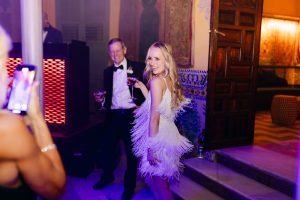 Después del brindis, la celebración se trasladó al patio de las columnas, donde comenzó la fiesta. La novia sorprendió cambiando su vestido largo por un segundo vestido blanco más cómodo, perfecto para disfrutar al máximo y darlo todo en la pista de baile junto a sus amigos.