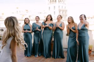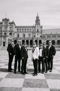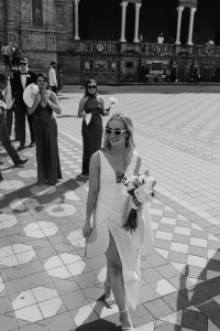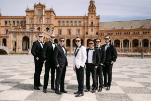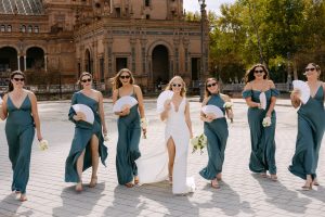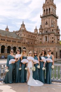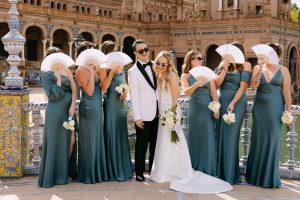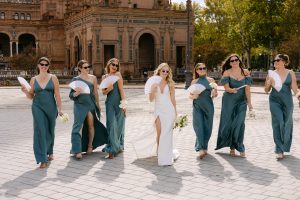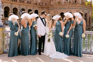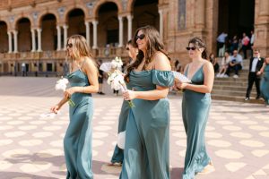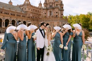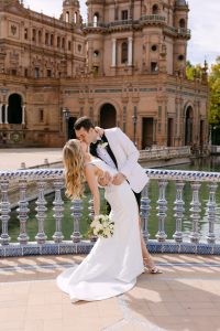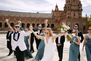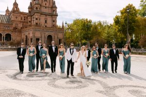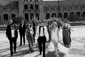 Después del emocionante encuentro, la pareja se dirigió con sus amigos a la majestuosa Plaza de España para realizar el reportaje fotográfico. Sus impresionantes arcos, la cerámica andaluza y la monumentalidad del espacio aportaron un carácter único a las fotografías, convirtiendo esta sesión en una parte inolvidable de su boda en Sevilla.