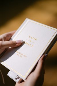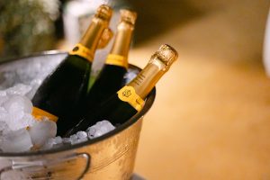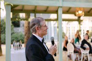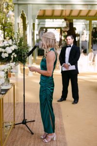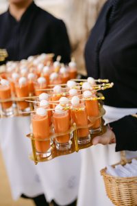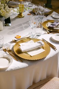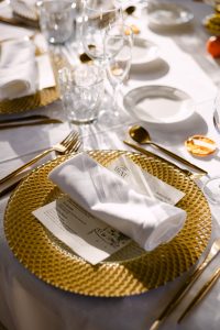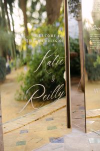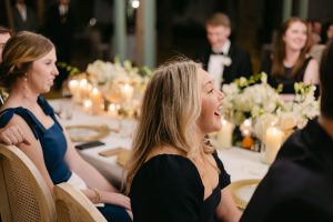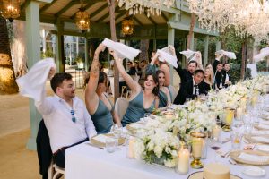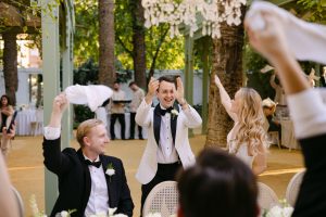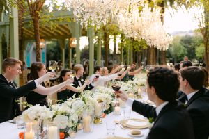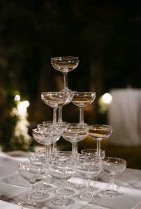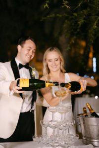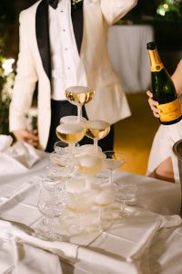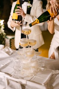 Para culminar la cena, Katie & Reilly sorprendieron a todos inaugurando una torre de copas. Juntos, vertieron el champán desde lo más alto, de forma elegante y animados por los invitados, simbolizando la unión y el comienzo de su nueva etapa.