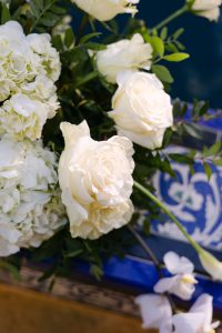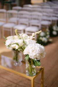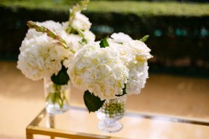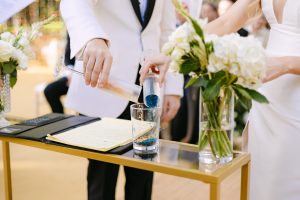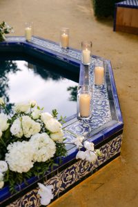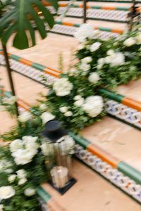Tras el reportaje, regresaron a Hacienda Villa Luisa para comenzar la ceremonia. El escenario no podía ser más especial: la fuente de azulejos como telón de fondo, una decoración exquisita con flores y rosas blancas, y la luz sevillana envolviendo cada instante.