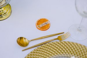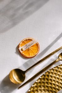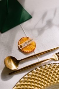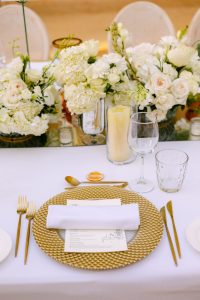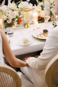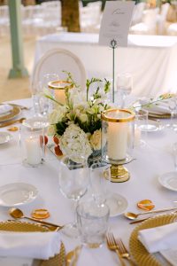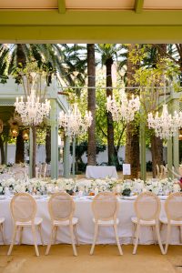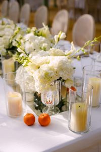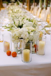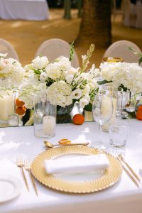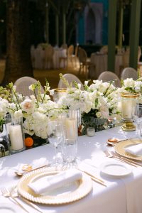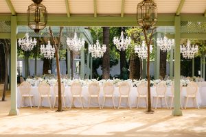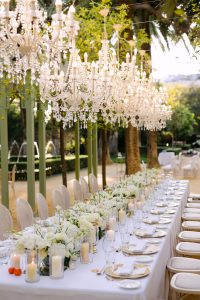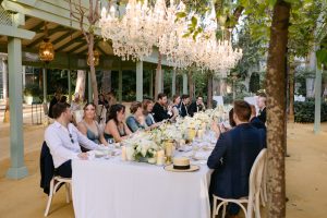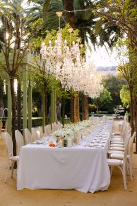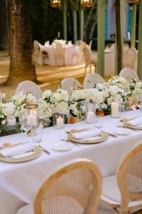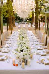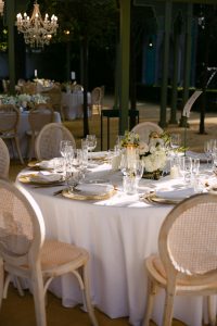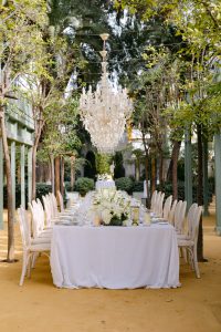 El espacio para la cena estaba transformado en un escenario de ensueño: mesas elegantemente vestidas, centros florales con rosas blancas, velas que aportaban una luz cálida y romántica, impresionantes lámparas de araña suspendidas sobre el patio y delicadas decoraciones frutales que añadían un toque mediterráneo y sofisticado.
