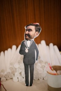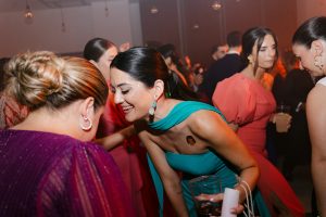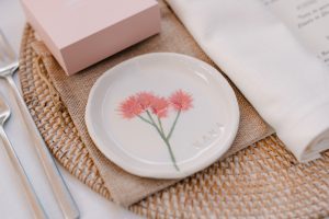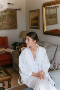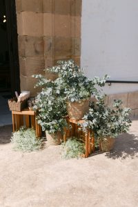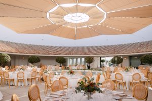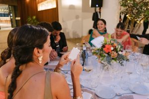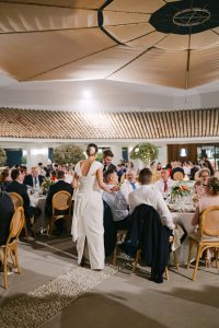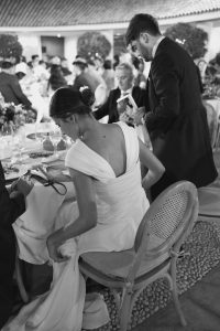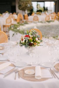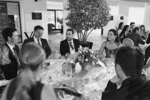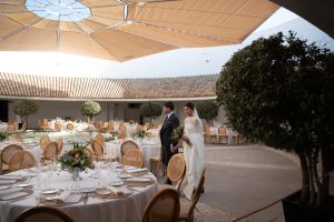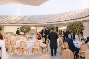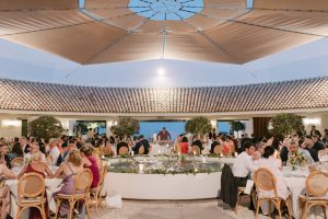 Posteriormente, los invitados pasaron al patio circular interior, con mesas rodeando una fuente central que aportaba un aire romántico y sofisticado. La decoración, con detalles de cerámica cuidadosamente seleccionados, daba un toque chic y personalizado a cada mesa. Durante la cena, se vivieron instantes entrañables entre conversaciones, risas y recuerdos compartidos.