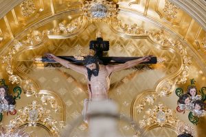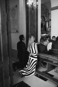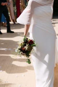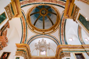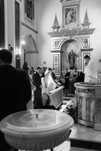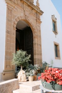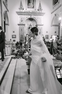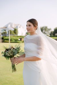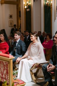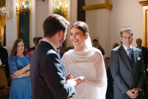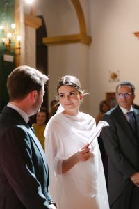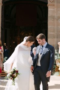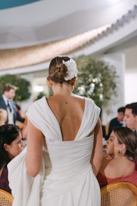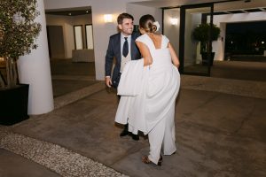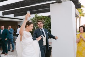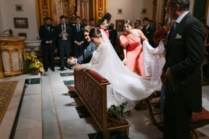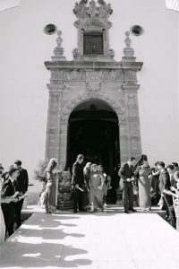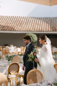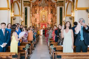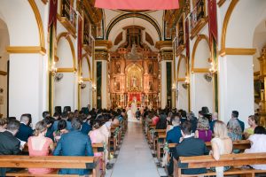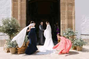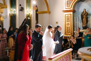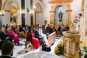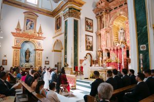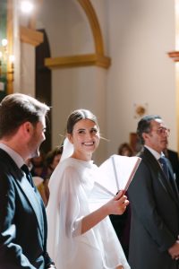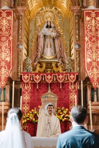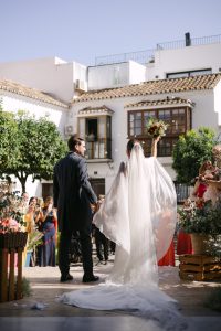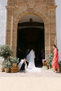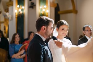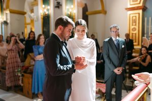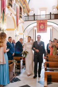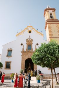 La ceremonia tuvo lugar en la emblemática Iglesia de Santa Maria de los Remedios, uno de los templos más representativos para celebrar bodas en Estepona. María llegó radiante, luciendo un vestido blanco espectacular acompañado de una capa que caía suavemente al caminar, aportando un aire sofisticado y romántico. Entró del brazo de su padre, protagonizando uno de los momentos más emotivos del día cuando Juan la vio llegar al altar.