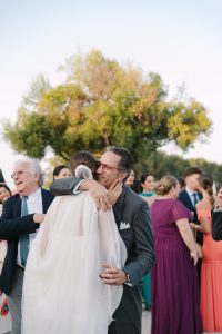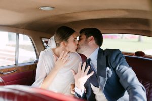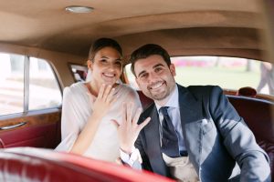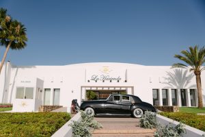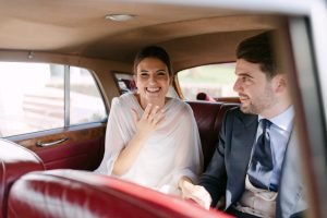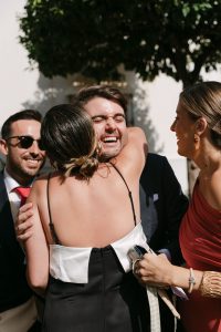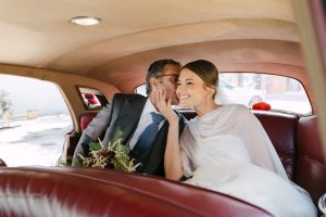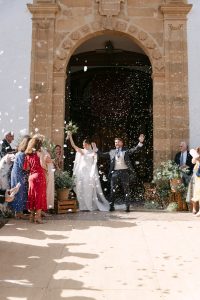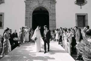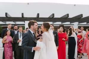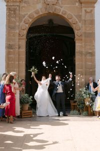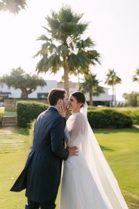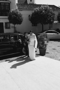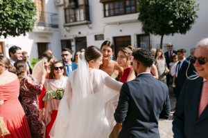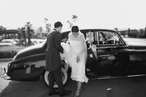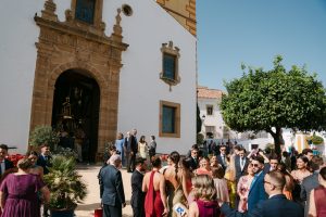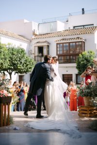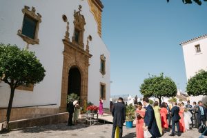 A la salida, los invitados los recibieron entre aplausos a las puertas de la iglesia. La emoción se reflejaba en cada sonrisa. Allí les esperaba un coche clásico imponente que los conduciría hacia el lugar de celebración, pasando por la exclusiva zona de Sotogrande.