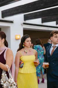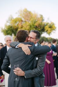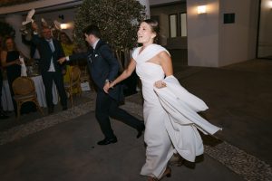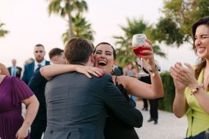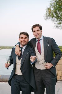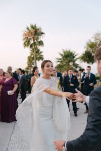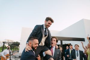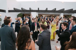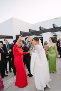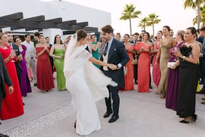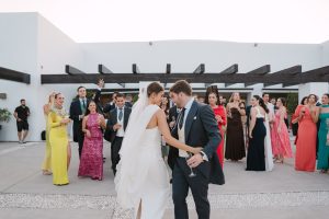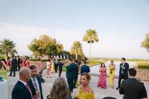 El cóctel tuvo lugar en el patio exterior, donde el horizonte marino acompañaba cada brindis. Los invitados disfrutaron de aperitivos variados mientras bailaban al ritmo del grupo de música en directo. Fue el momento perfecto para capturar fotografías divertidas y espontáneas con familiares y amigos.