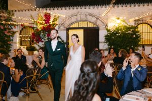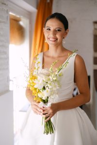 La organización, impecablemente coordinada por La Organizadora de Sueños, permitió que cada momento fluyera según lo previsto. La novia llegó puntual y radiante, con un delicado ramo de nardos, rosas blancas y un sutil toque de flores amarillas. Entró velada, luciendo un precioso vestido con escote en pico, acompañada del brazo de sus hermanos, en uno de los momentos más emotivos del día.