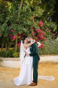 Tras la ceremonia, nos dirigimos a la Hacienda San Luis de Mejina para realizar la sesión de novios. Este enclave andaluz ofrece rincones únicos: patios señoriales, jardines llenos de encanto y una arquitectura tradicional perfecta para una sesión romántica y elegante.