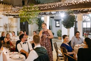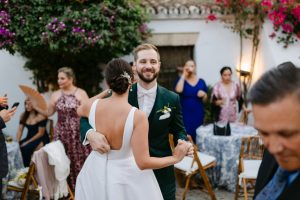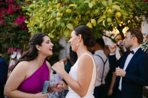 El cóctel se celebró en un patio rodeado de buganvillas, donde los invitados disfrutaron de aperitivos típicos de Andalucía. Un grupo de músicos cubanos llenó el ambiente de ritmo y alegría, haciendo bailar a todos desde el primer momento.